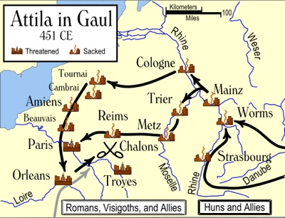 Picture: The general path of the Hun forces in the invasion of Gaul.