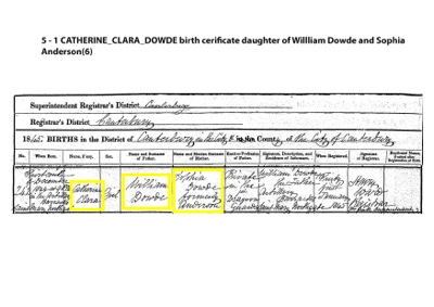 Picture: 5 - 1 CATHERINE_CLARA_DOWDE birth cerificate daughter of Willliam Dowde and Sophia Anderson(6)