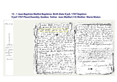 Picture: 15 - 1 Jean Baptiste Maillot Baptême Birth Date 9 juil. 1707 Baptism 9 juil 1707 Place Chambly, Québec Father Jean Maillot (14) Mother Marie Mulon