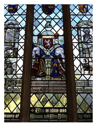 Picture: Stained glass in Holy Trinity Church, Long Melford, Suffolk - Left, Elizabeth Tilney. Right: Agnes Tilney, On her kirtle, she displays her paternal arms Tilney/by mantle the 1/4 arms Howard. Below: Latin2Eng: "Elizabeth born Tilney wife of Thomas Howard"