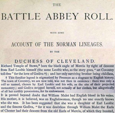 Leofric, Earl of Mercia, and Lady Godiva in The Battle Abbey Roll, Vol. 2, pgs. 118 and 262