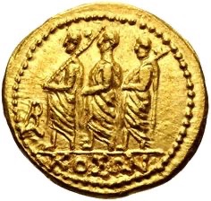 Picture: This is a gold coin from the republican era and depicts a consul and two lictors walking with him. The lictors.