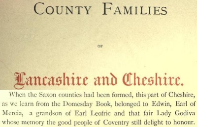 Leofric, Earl of Mercia, and Lady Godiva in County Families of Lancashire and Cheshire, pg. 118