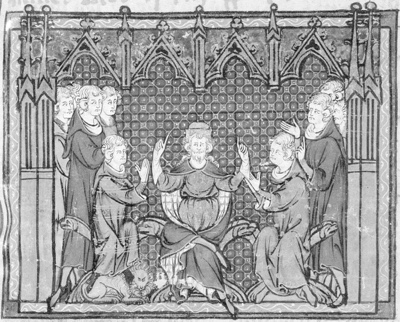 Picture: Charles Martel divides the realm between Pepin and Carloman. Miniature (illuminated manuscript) from Grandes Chroniques de France.