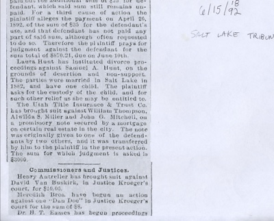 Divorce notice between Laura Cushing & Samuel Hunt printed in SL Tribune 15 Jun 1892